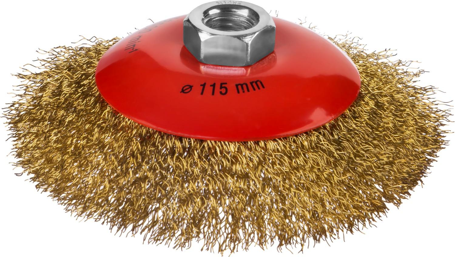 Щетка d=115 мм, коническая для УШМ, витая стальная латунированная проволока 0,3 мм, MIRAX 35143-115