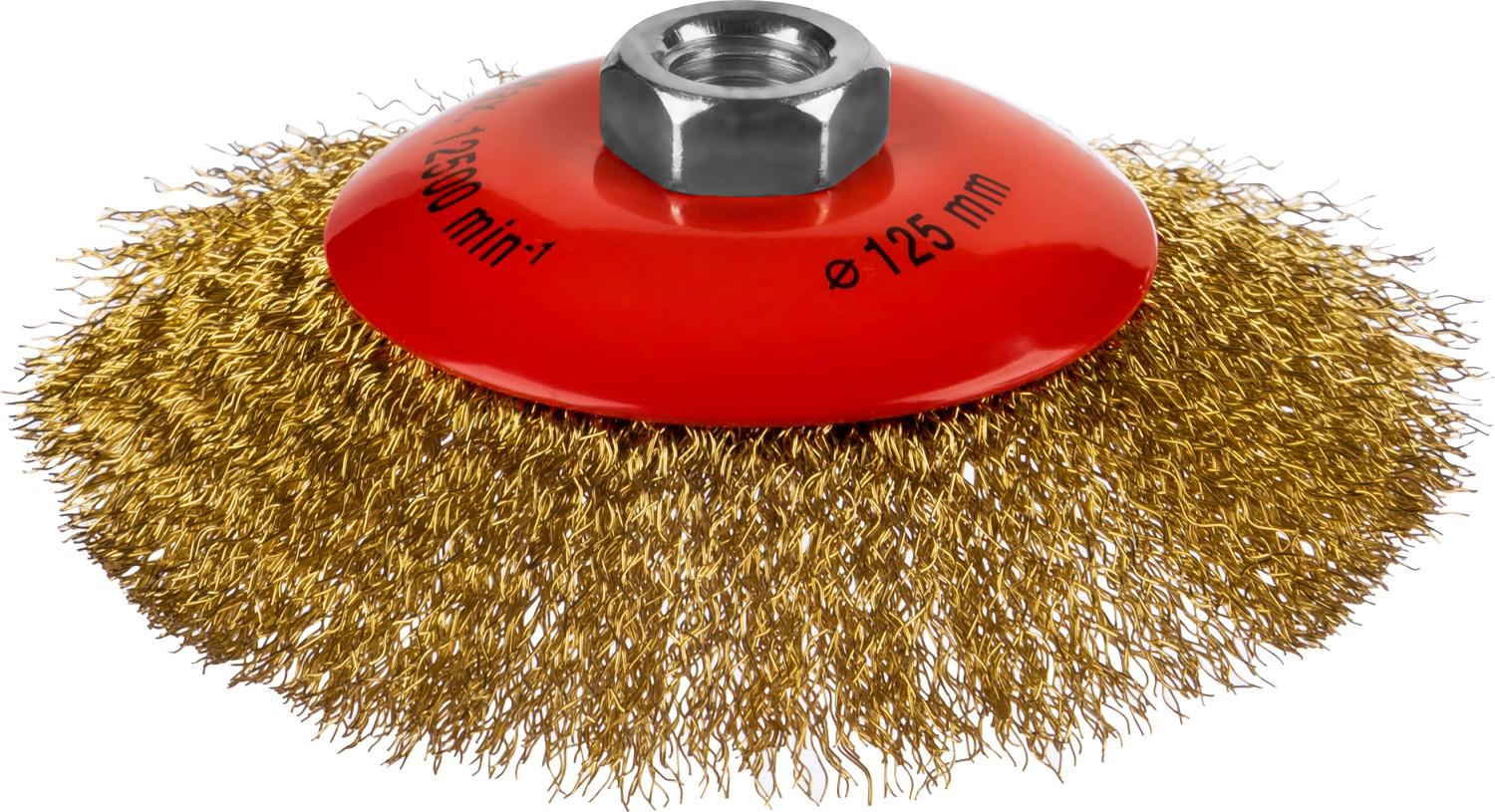 Щетка d=125 мм, коническая для УШМ, витая стальная латунированная проволока 0,3 мм, MIRAX 35143-125